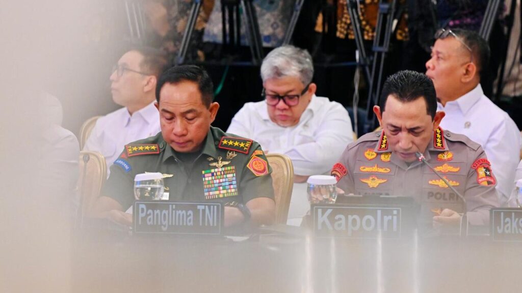 Commander of the Indonesian National Defense Forces Gen. Agus Subiyanto and the Chief of National Police Gen. Listyo Sigit Prabowo at the plenary cabinet meeting, the State Palace, Central Jakarta, Monday (12/15). (Photo by: BPMI of Presidential Secretariat/Laily Rachev)