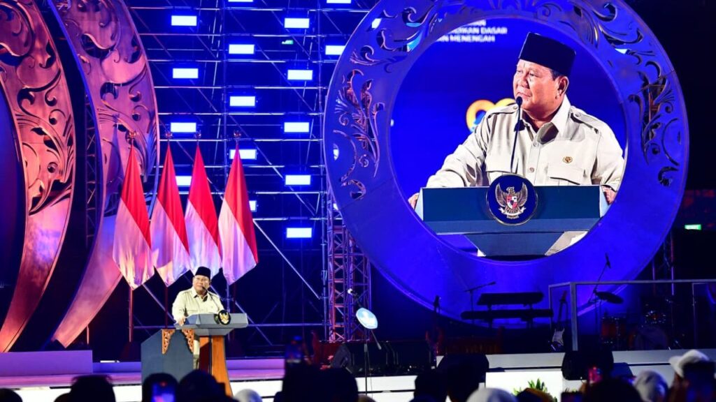 President Prabowo Subianto delivers remarks at the Peak Event of the 2025 Teachers’ Day Commemoration held at the Indonesia Arena, Jakarta, Friday (28/11). (Photo by: BPMI of Presidential Secretariat)